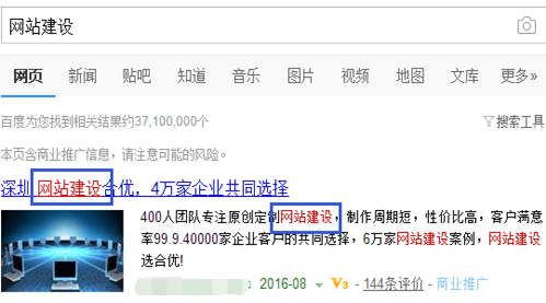 好比搜索“網站建設”時,創意的飄紅情況如下,其中與搜索詞一致或意義相近的部分均獲得了飄紅: