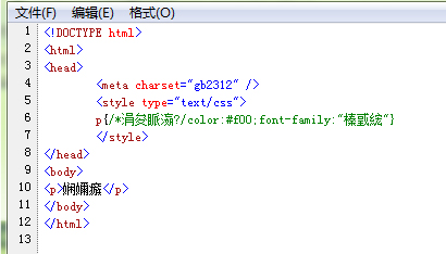 <!DOCTYPE html> <html> <head> <meta charset="gb2312" /> <style type="text/css"> p{/*三漢字*/color:#f00;} </style> </head> <body> <p>測試</p> </body> </html>